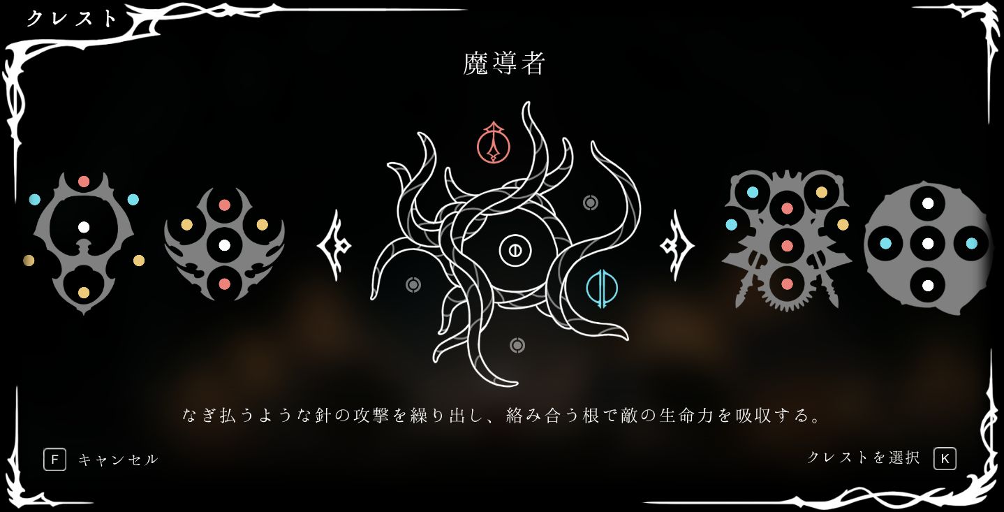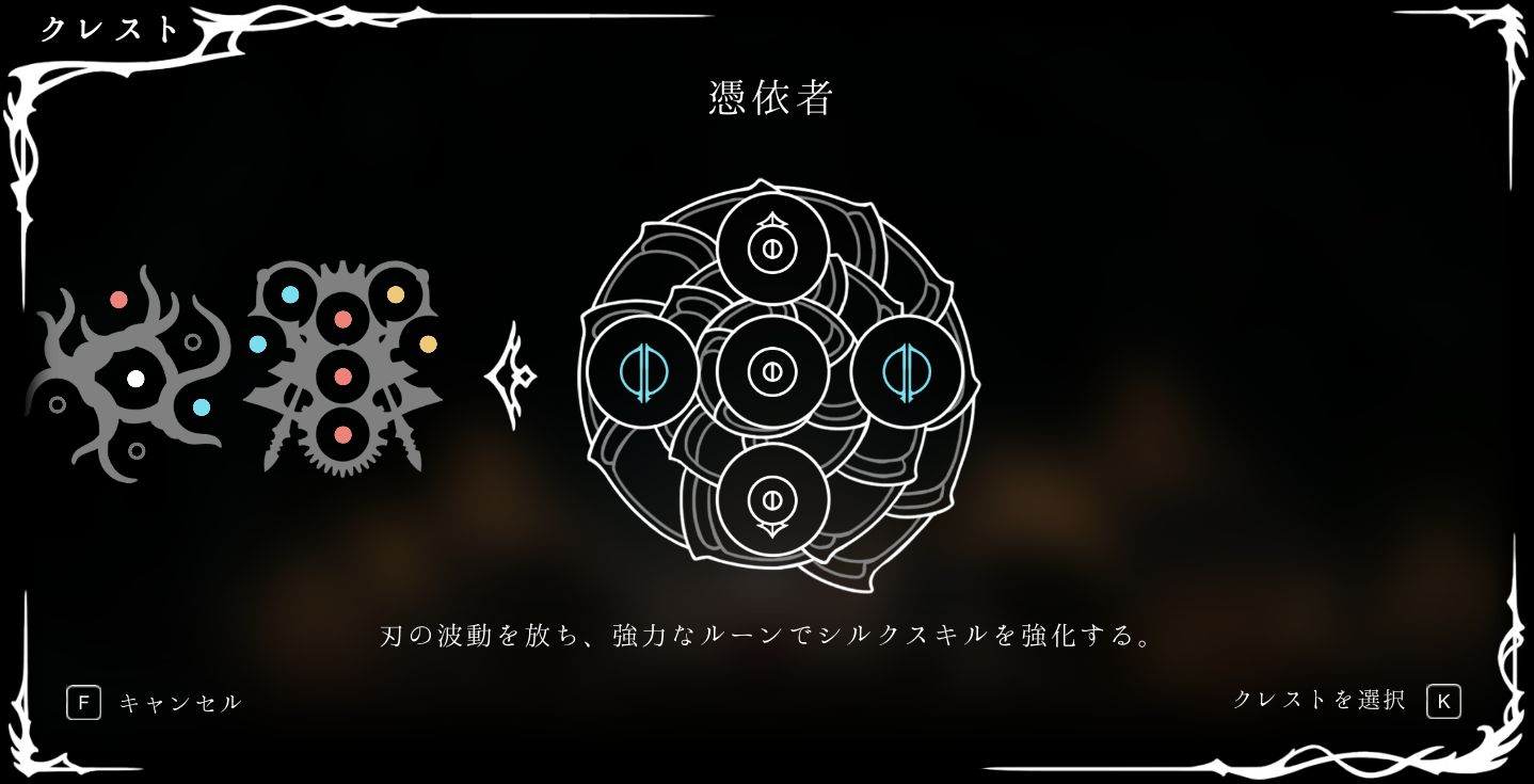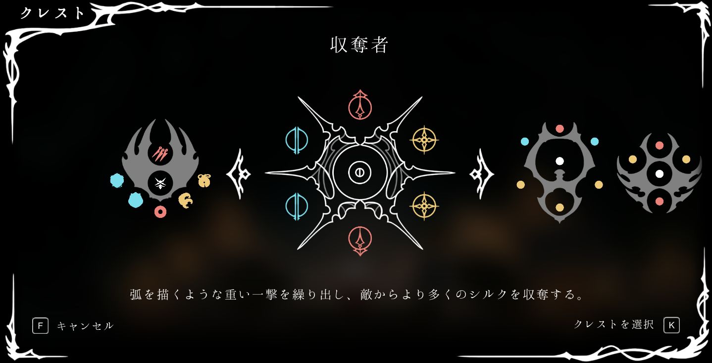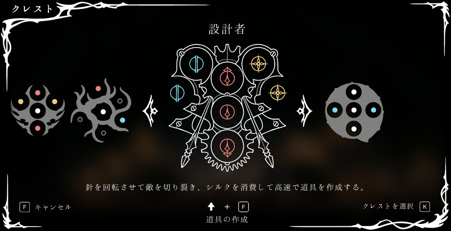道具を捨てて己の身一つで戦いたい人向けのクレストです。やたらと距離を取る敵が多いシルクソングに適合しすぎていて超強い。道具なんていらんかったんや。