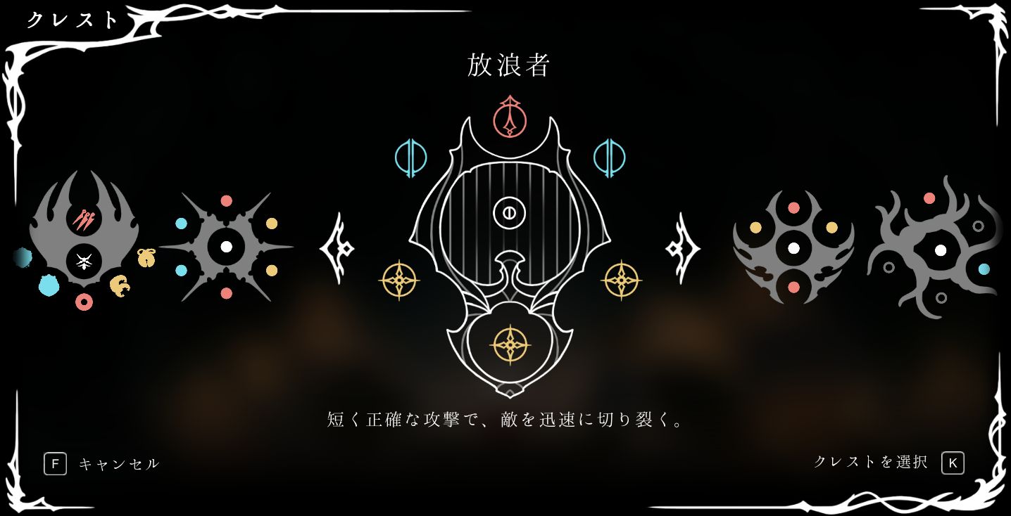 溜め以外の全ての攻撃において足が止まらず、常に動きながら攻撃できます。その代わり射程が短く、敵に衝突しやすい。シルクソングに登場する敵(雑魚、ボス含め)の多くが動き回るため、放浪者クレストは難易度がお高めですが、攻撃を当て続けられるなら強力。