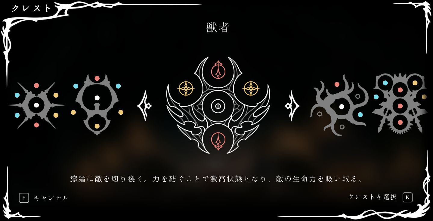 ダメージを受けたり、ベンチで休憩するとリセットされてしまうため、初見プレイで狩猟者クレストの効果を活かすのは困難。スピードランやいずれ実装されるであろうボスチャレンジ用だと推測できます。