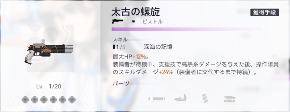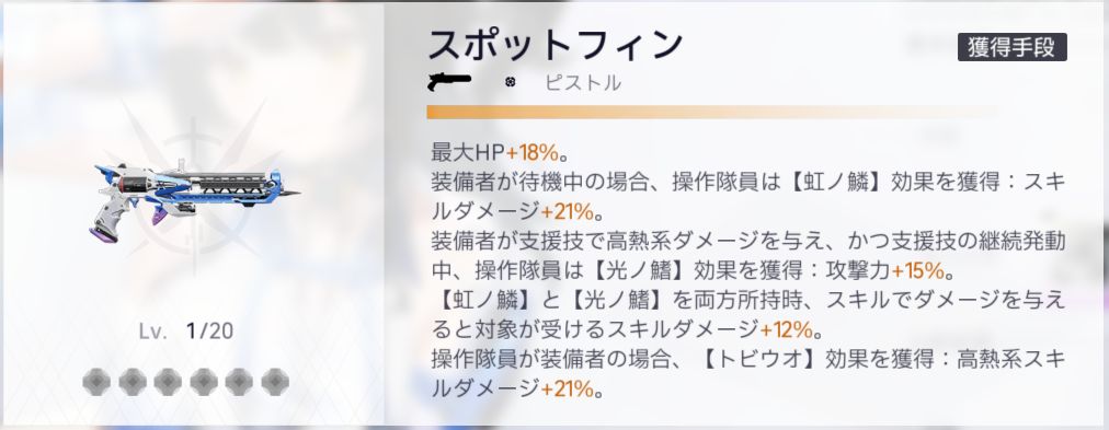 装備者が支援技で高熱系ダメージを与え、かつ支援技の継続発動中、操作隊員は【光ノ鰭(ヒレ)】効果を獲得:攻撃力+25%