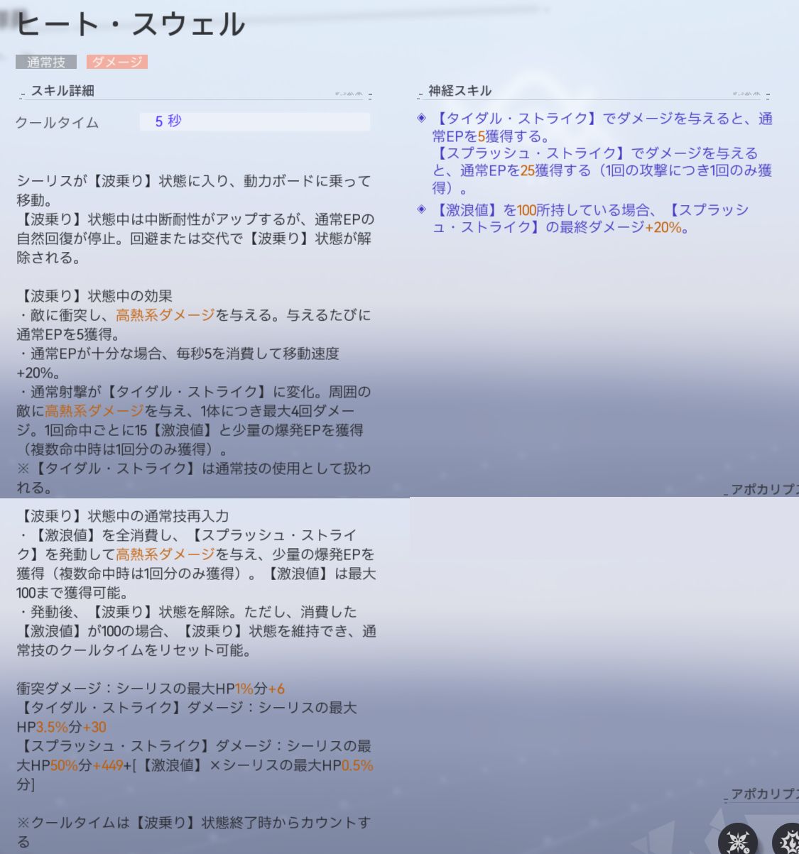 ダメージ倍率 | 衝突ダメージ:シーリスの最大HP1%+6 【タイダル・ストライク】ダメージ:シーリスの最大HP3.5%+30(4HIT) 【スプラッシュ・ストライク】ダメージ:シーリスの最大HP50%+449+(【激浪値】*シーリスの最大HP0.5%) |