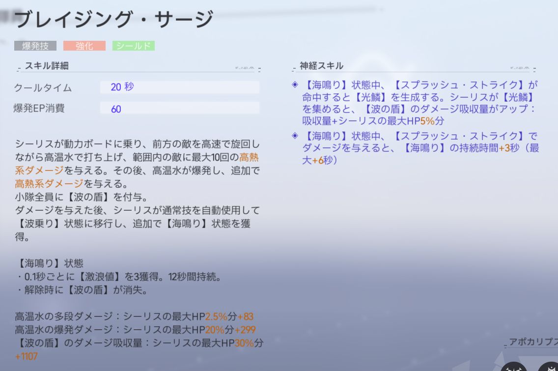 ダメージ倍率 | 多段ダメージ:シーリスの最大HP2.5%+83(10HIT) 爆発ダメージ:シーリスの最大HP20%+299 【波の盾】ダメージ吸収量:シーリスの最大HP30%+1107 |