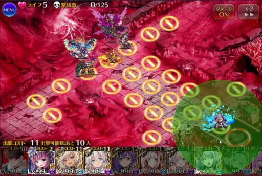 撃破数40あたりで上から登場するボスに遠距離マス(トリステラがいるマス)が狙い撃ちされます。筋肉質な犬みたいなやつが2匹登場するのが合図。下からギルガメッシュが登場するタイミングと同じなので頭から抜けがち。