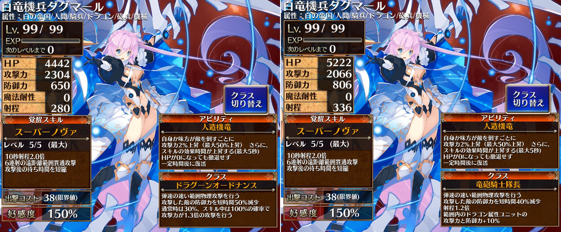 メインで使用するであろう覚醒スキルによって射程が2倍に伸びる点と、役割的にちょっとでも火力欲しいよねーっていう考えからそうしましたが、マップ全域をカバーできそうな「竜砲騎士隊長」も魅力的です。