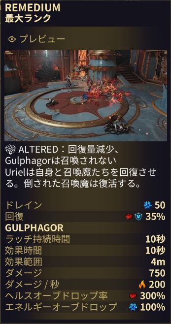 | VORUNA | LYCATHS HUNT | 近接攻撃で倒された敵は確率でヘルスオーブをドロップし、ヘッドショットで倒された敵は確率でエネルギーオーブをドロップする ※パッシブ削除 | – |