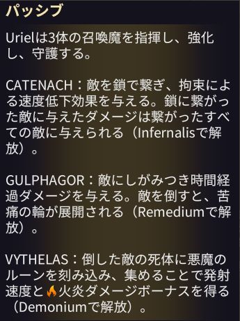 | アビリティ威力 | CATENACHの速度低下率 GULPHAGORの2種オーブドロップ率 VYTHELASの2種バフ量 REMEDIUM(2番)の回復量 DEMONIUM(3番)のダメージ脆弱性率 BRIMSTONE(4番)のダメージ量 |