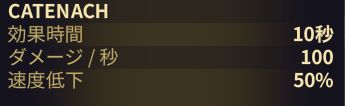 | CATENACH | 敵を鎖でつないでダメージを連鎖させる。 同時に速度低下効果を与える。 ![]() ▼影響を受けるステータス 効果時間:アビリティ効果時間 ダメージ:アビリティ威力 速度低下:アビリティ威力 |
