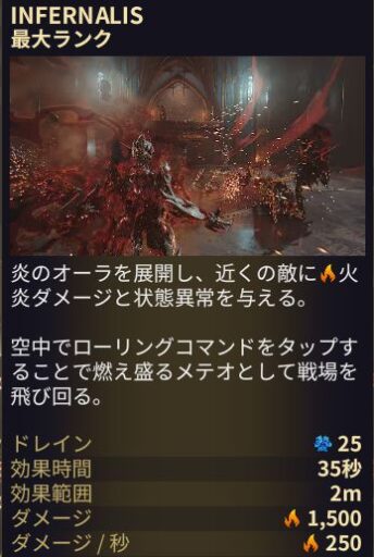 | GULPHAGOR | 敵に持続ダメージを与える。 倒すと苦痛の輪が展開される。 ヘルスオーブとエネルギーオーブが確定でドロップする。 ![]() ▼影響を受けるステータス ラッチ(拘束)持続時間:アビリティ効果時間 苦痛の輪の効果時間 :アビリティ効果時間 苦痛の輪の効果範囲 :アビリティ効果範囲 ラッチ(拘束)ダメージ:アビリティ威力 苦痛の輪のダメージ(火炎):アビリティ威力 オーブドロップ率 :アビリティ威力 |