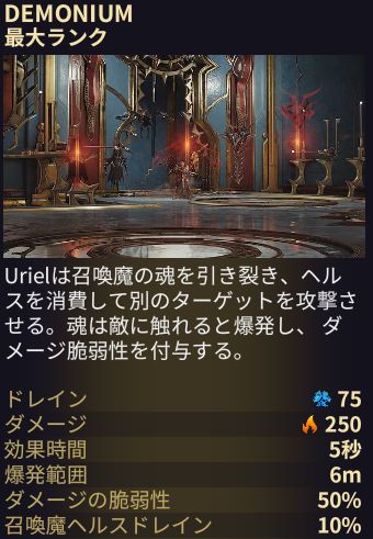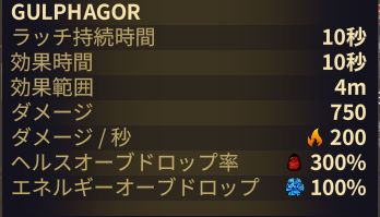 | アビリティ威力 | CATENACHの速度低下率 GULPHAGORの2種オーブドロップ率 VYTHELASの2種バフ量 REMEDIUM(2番)の回復量 DEMONIUM(3番)のダメージ脆弱性率 BRIMSTONE(4番)のダメージ量 |