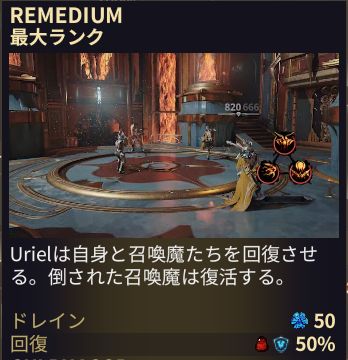 回復量は最大ヘルスの50%分で、ステータスを底上げすると回復量も上昇します。アビリティ威力も影響あり。シールドが切れると無敵時間が発生する仕様上、エネルギーがある間は不沈艦と化します。便利。