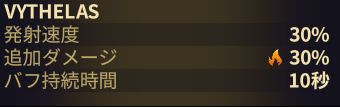 | VYTHELAS | 倒した敵からルーンを集めることで発射速度と火炎ダメージボーナスを得る。![]() ▼影響を受けるステータス 発射速度 :アビリティ威力 追加ダメージ:アビリティ威力 バフ持続時間:アビリティ効果時間 |