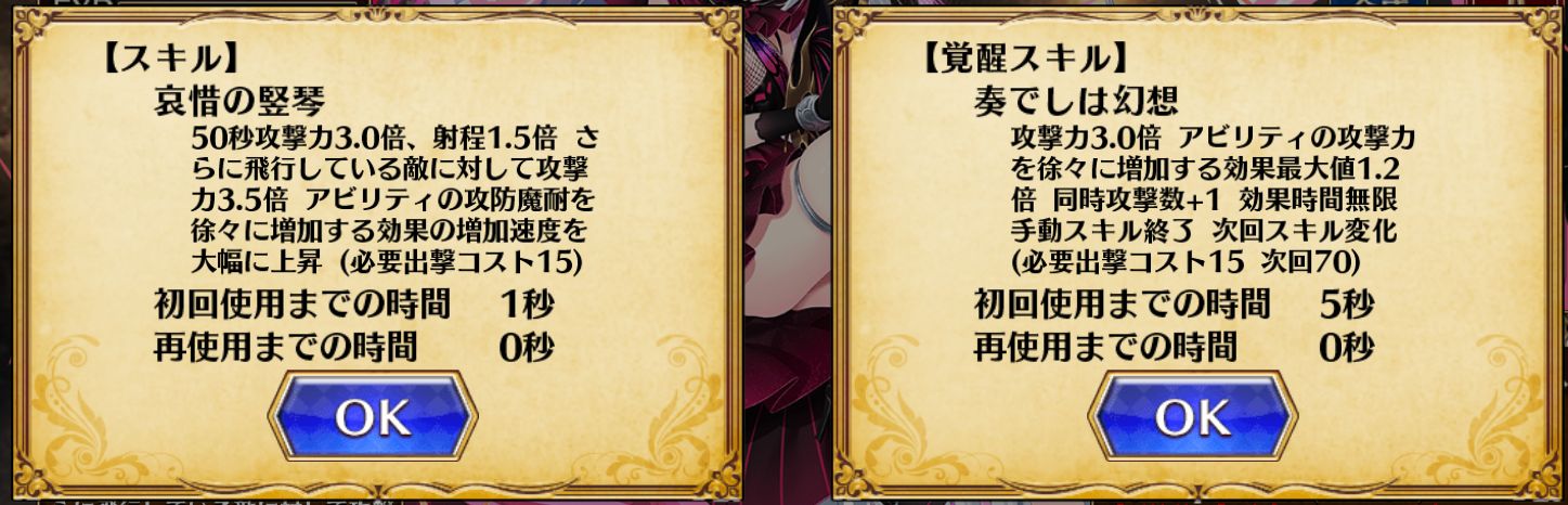 | 効果 | 【1】 ・出撃コスト15必要 ・アビリティの攻撃力上昇の最大値が1.2倍 ・マルチ+1 ・手動でスキルを終了可能 【2】 ・出撃コスト70必要 ・アビリティの攻撃力上昇の最大値が1.6倍 ・攻撃力が瞬時に上昇する ・マルチ+3 ・手動でスキルを終了可能 【3】 ・出撃コスト105必要 ・アビリティの攻撃力上昇の最大値が2倍 ・攻撃力が瞬時に上昇する ・マルチ+5 |