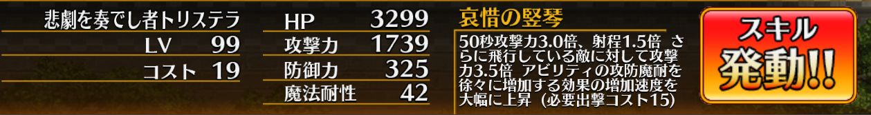 | 自己倍率 | [攻撃力]3.0倍 [射程]1.5倍 [飛行している敵に対する攻撃力]3.5倍 |
