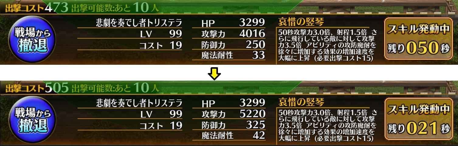 | 効果 | ・出撃コスト15必要 ・アビリティのステータス上昇速度が大幅に上昇 ・オートスキルの対象外 |