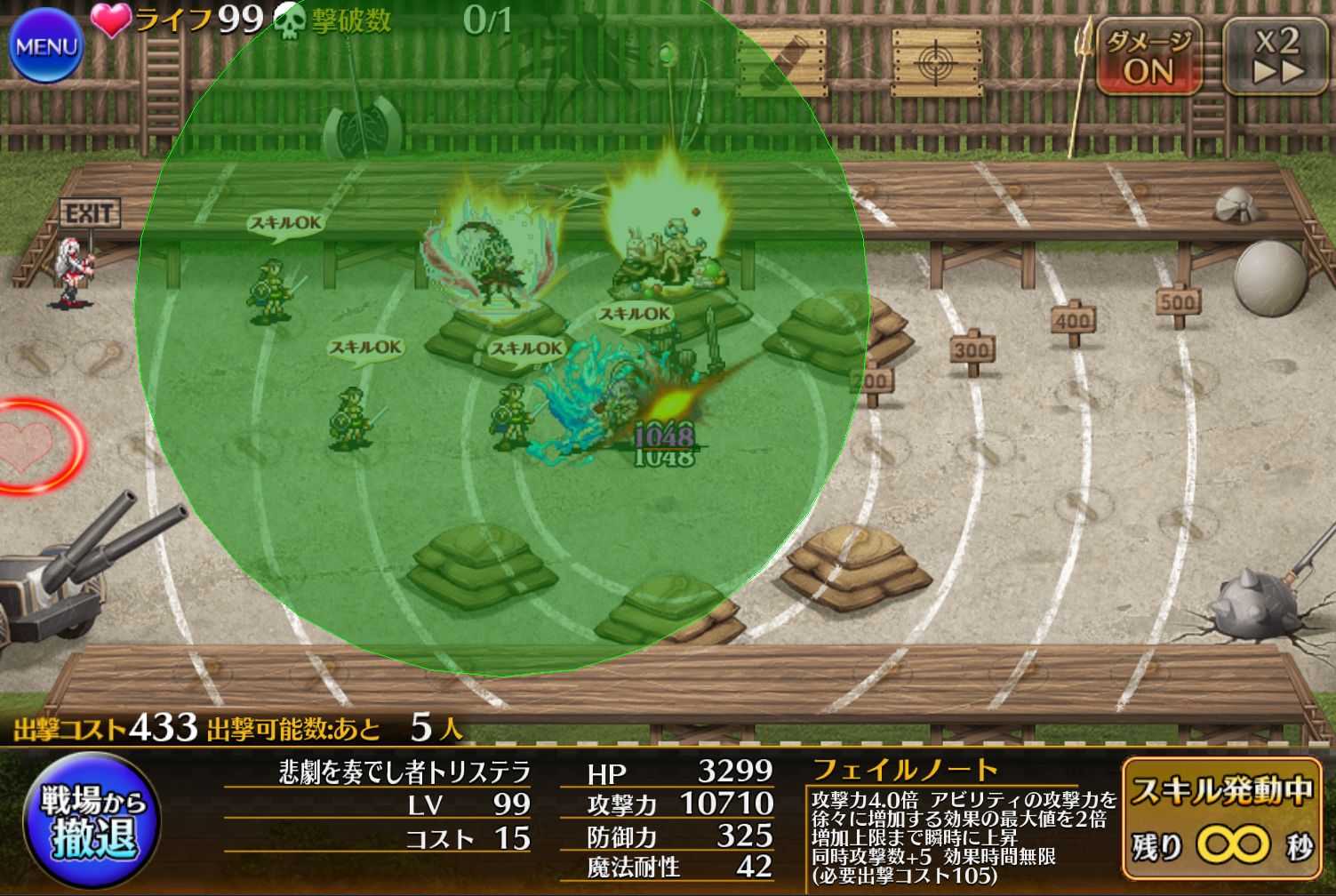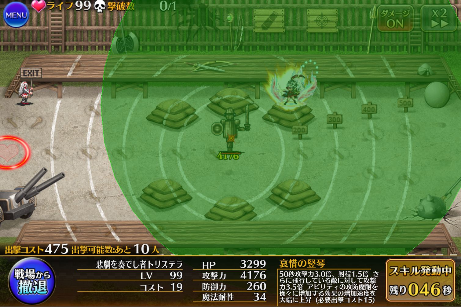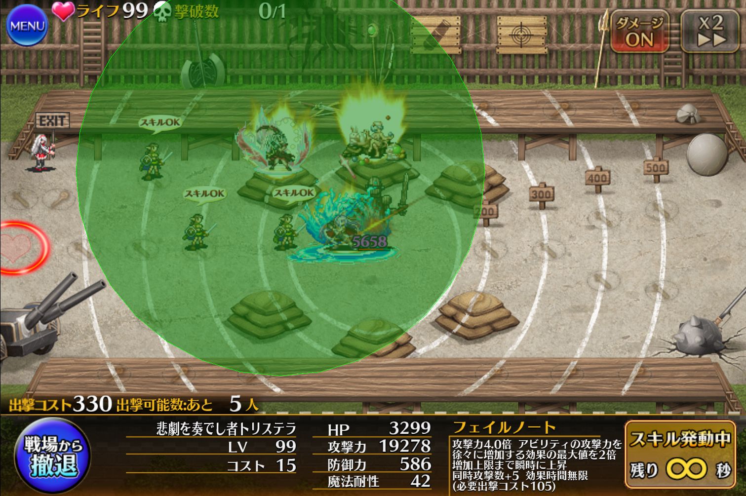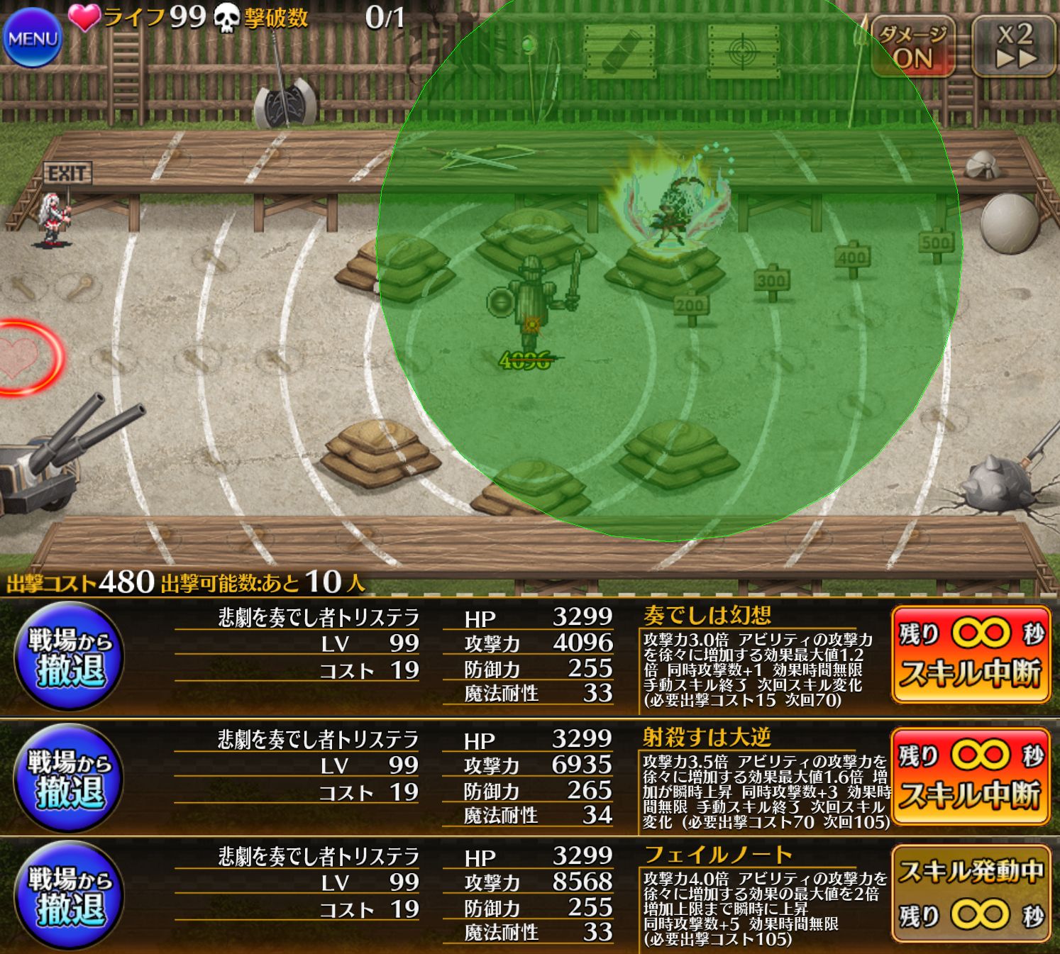 本人の攻撃もマルチ化するおかげで雑魚処理を任せられそうです。それぞれの段階で永続なので途中で止められるのも良い点。ただし、射程が伸びない点には要注意!トリステラのバフは”範囲内にいる味方ユニット”に対して効果を発揮します。ここからさらにフィネス等で広がることを考慮すると、デフォルトでこんだけ広ければ十分と言われたらそれはそう。